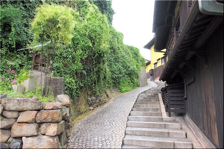 「桝屋清右衛門宅」の屋根に注目。外観の側面から見るとよくわかるのですが、屋根の前側(前流れ)を伸ばして、正面から見たときに実際よりも建物を大きく見せかけています。こういった手法は鞆では19世紀以降に流行。