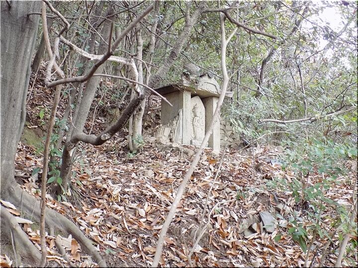 暫く進みますと、斜面に、石仏が置かれました小さな祠が…道中の安全を祈願し設置されましたのかも…