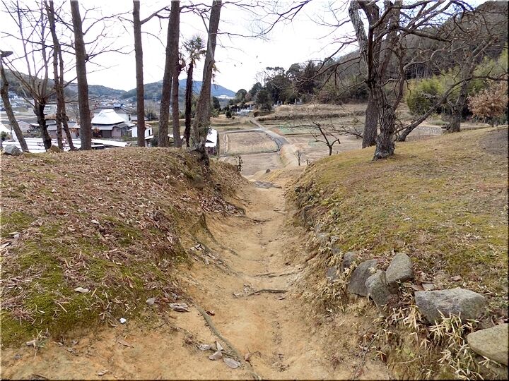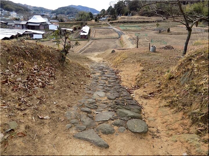 祠から少し上側に向かってみますと、うん、うん、有りましたネ。農地の方に向かいます道が…部分的ではありますけど、石を敷き詰めた立派な道であります。