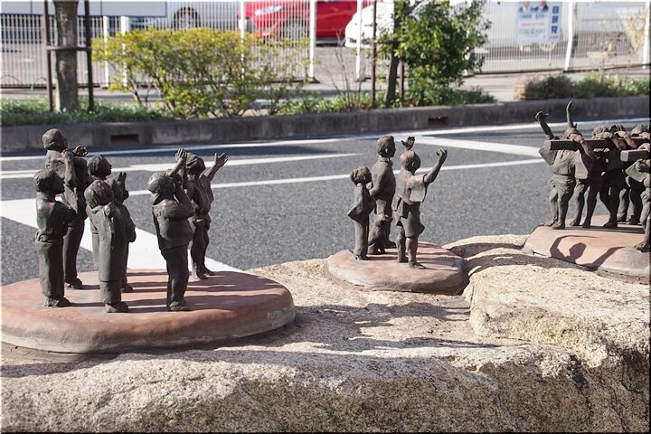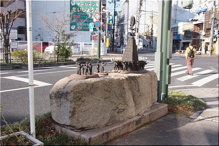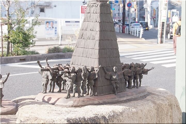 国道2号線を渡り、「シンボルロード『きたはま通り』」を、御舟町--船町--元町…と、福山市都心部の景観に眼を向けながら歩いておりまして、通過時に「木綿橋」跡をパチリ。そして、少し進んで、いつものように信号待ちを利用し、「福山とんど」のモニュメントもパチリです(^.-)☆