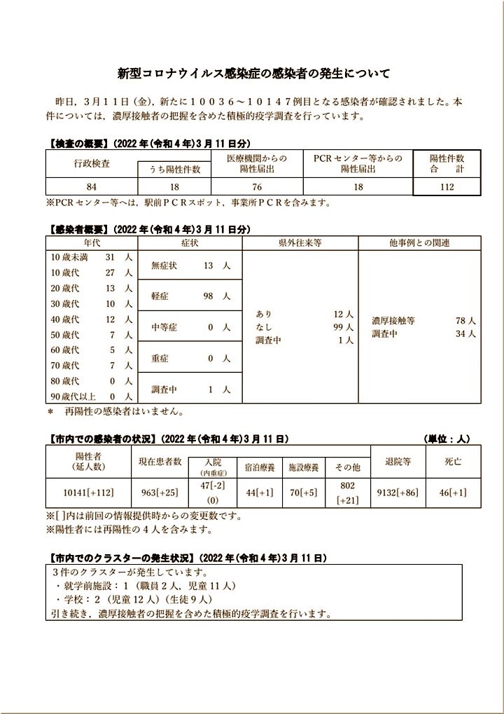 3/11(金)の感染者概要では、10歳未満が31名・10歳代が27名…と、学童の皆様への感染が拡大していますようであります。水呑小学校でも、3/12(土)~3/16(水)間の学級閉鎖。昨日、我が家にヤッて来ました孫達は何にも言っておりませんでしたけど…