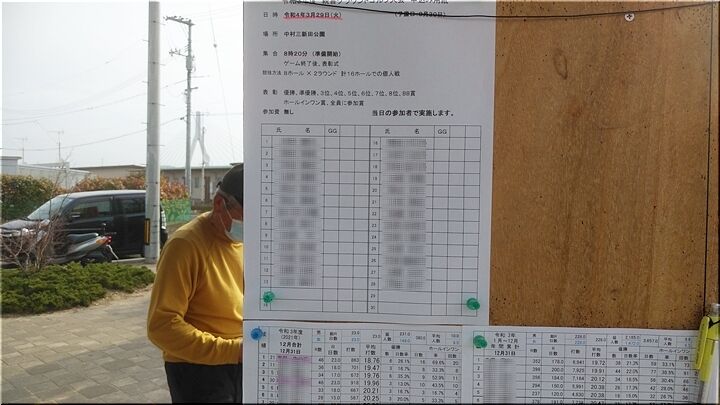 掲示板には、このグラウンドゴルフクラブ単体での「親善グラウンドゴルフ大会」開催のご案内が…