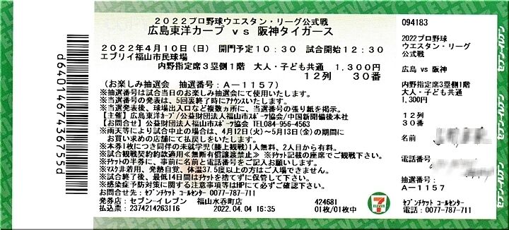 昨日の午後、4/10(日)開催のウエスタンリーグ「広島vs阪神」戦も近付いて来まして、そろそろチケットを求めなくては…と、前売り券販売所を確認してみますと、セブンチケットWEB限定での販売との事。