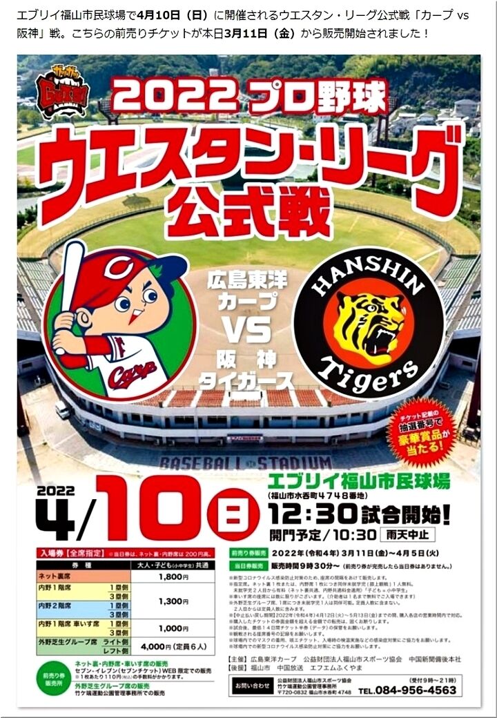 週間天気予報によりますと、4/10(日)の福山市は、「晴れ・23℃」のようですから、気持ちよく野球観戦が出来そうです。
