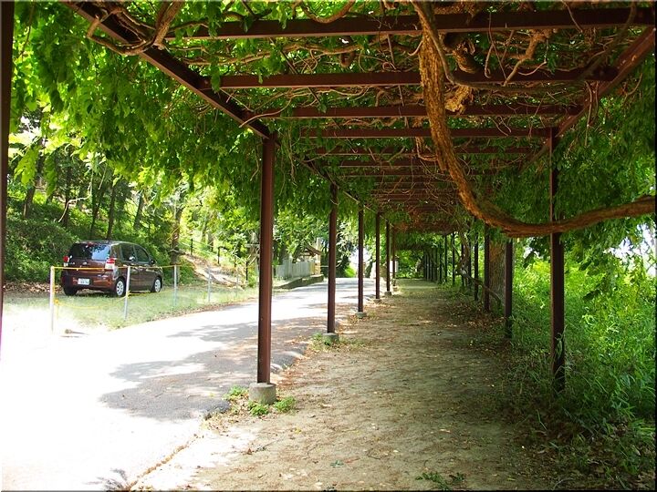 墓地入口の市道まで下りて来ますと、岡山神社の社殿への石段登り口まで続きます藤棚が…