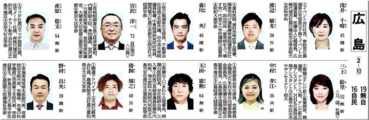 ふ~ん、広島選挙区は、改選数2議席に対し10名の方々が立候補のようであります。