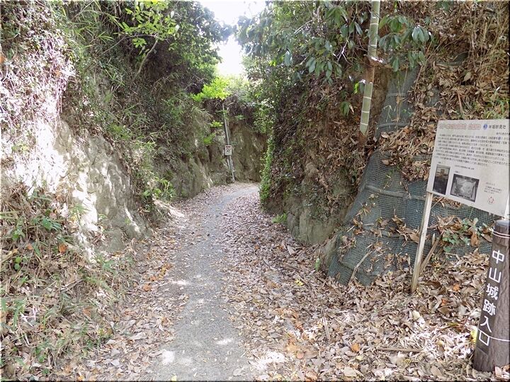 「長和・草戸新四国八十八ヶ所第12番焼山寺」を通り過ぎますと、スグに右手に階段上り口脇に『中山城跡入口』の案内標識が…結構新しいので、ここ近年に設置されましたのかも…