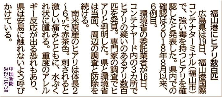 こんな嫌なニュースから1ヶ月も経ませんのに、今度は、福山港でヒアリ数百匹が確認されましたようであります。広島県内での確認は、4年振りとの事であります。