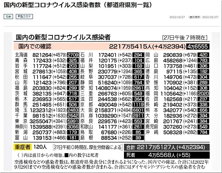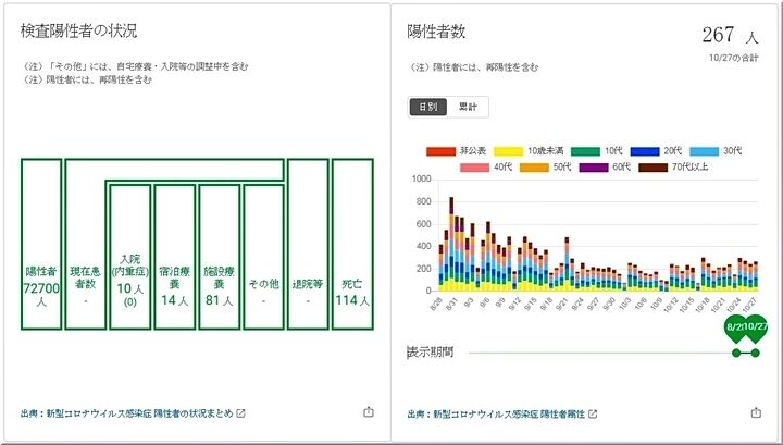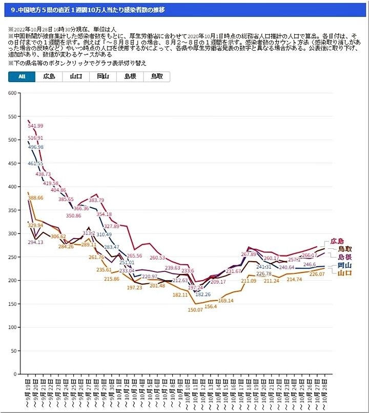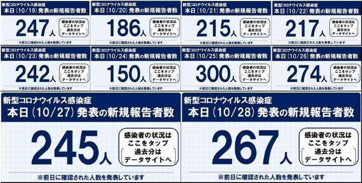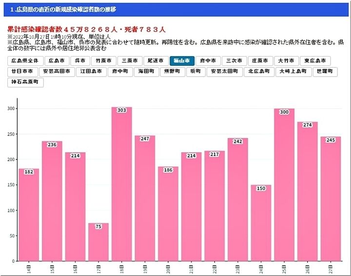 昨日の発表では、267人。一週間前の10/21・215人対比で、+52人。広島県全体では、10/28・1,264人、10/21・914人で、+350人と増加推移。