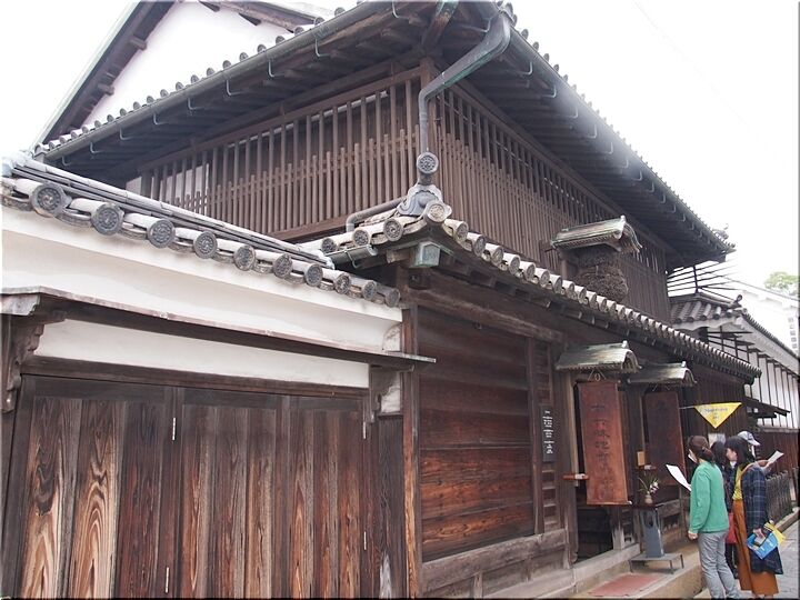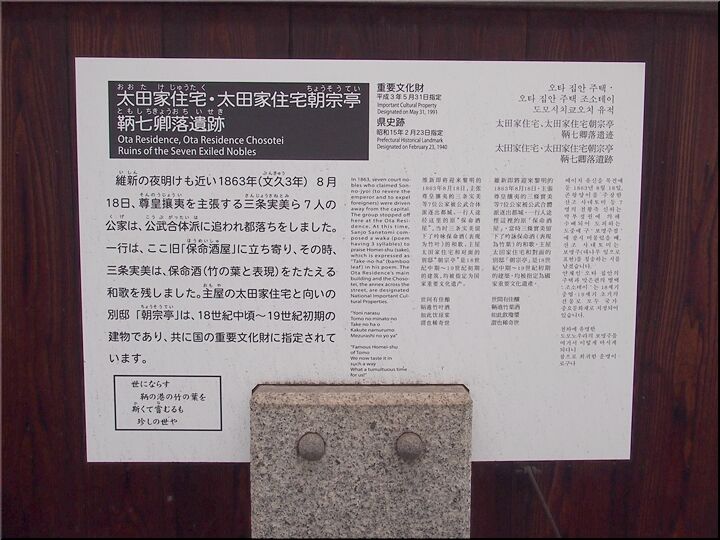 維新の夜明けも近い1863年(文久3年)8月18日、尊皇攘夷を主張する三条実美ら七人の公家は、公武合体派に追われ都落ちをしました。一行は、ここ旧「保命酒屋」に立ち寄り、その時、三条実美は、保命酒(竹の葉と表現)をたたえる和歌を残しました。主屋の太田家住宅と向いの別邸「朝宗亭」は、18世紀中頃~19世紀初期の建物であり、共に国の重要文化財に指定されています。