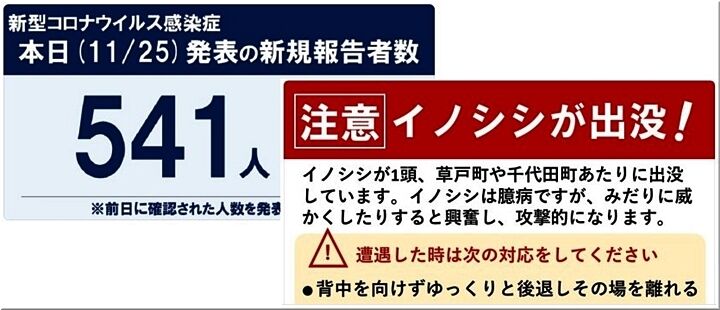 本日のコロナ感染者は何人?…と、LINEで確認しておりますと、んっ!?…福山市から、イノシシ出没による注意喚起ですか(^-^;