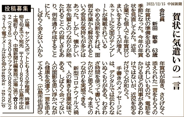 これは、中国新聞sanの「広場」に掲載されました読者の方の投稿記事なんですけど、そうですネ、確かに企業・個人に拘わらず年賀状じまいをされますケースが、近年、多くなって来ましたネ。