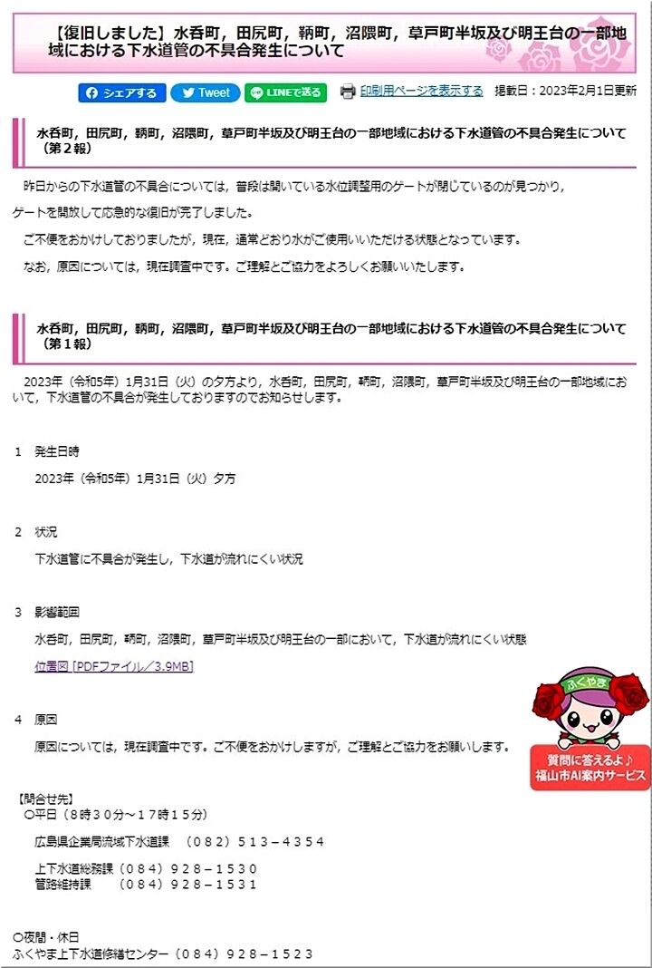 で、何の広報だったのだろう?…と、市のホームページを覗いてみましたら、ふん、ふん、1/31(火)の夕方から、水呑町・田尻町・鞆町・沼隈町・草戸町半坂及び明王台の一部地域で、下水道管の不具合が発生しています…との事でありました。