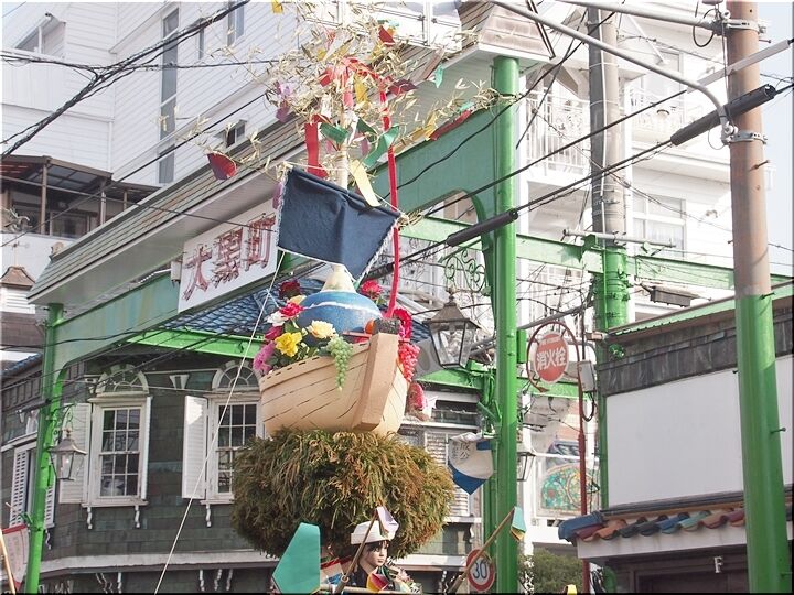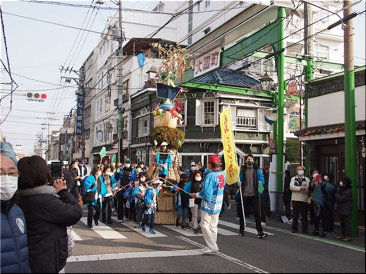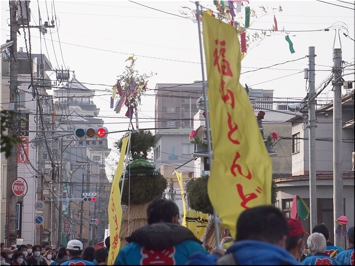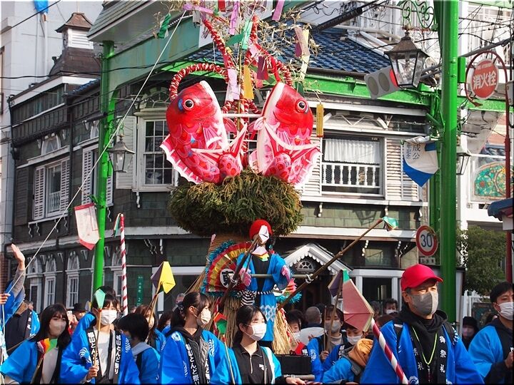 「懸鯛とんど」は、上魚屋町の魚問屋が、お祝いに鯛を2尾献上したことから、懸鯛の飾りを作り、とんどに飾り付けたものといわれております。