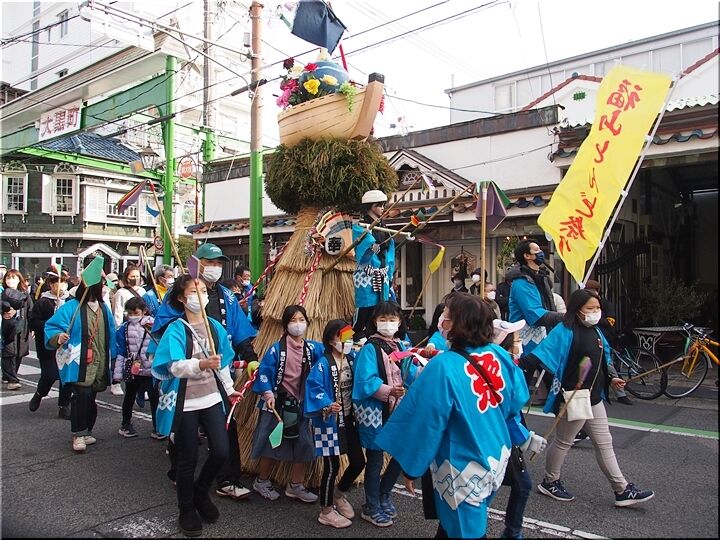 深津学区のとんど飾りの宝船には福山初代藩主「水野勝成公」の家紋である「丸に抱き沢瀉」を船横にあしらって、福山城築城400年をお祝いしております。