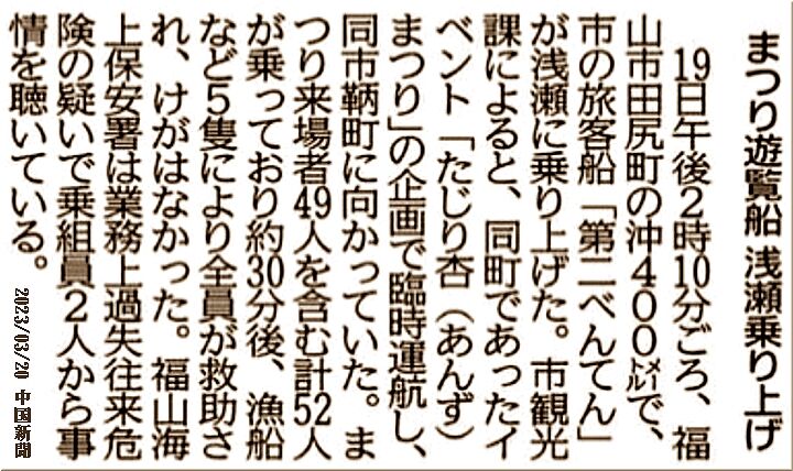 19日午後2時10分ごろ、広島県福山市田尻町の沖400メートルで、市の旅客船「第二べんてん」が浅瀬に乗り上げた。市観光課によると、同町であったイベント「たじり杏(あんず)まつり」の企画で臨時運航し、同市鞆町に向かっていた。まつり来場者49人を含む計52人が乗っており約30分後、漁船など5隻により全員が救助され、けがはなかった。福山海上保安署は業務上過失往来危険の疑いで乗組員2人から事情を聴いている。