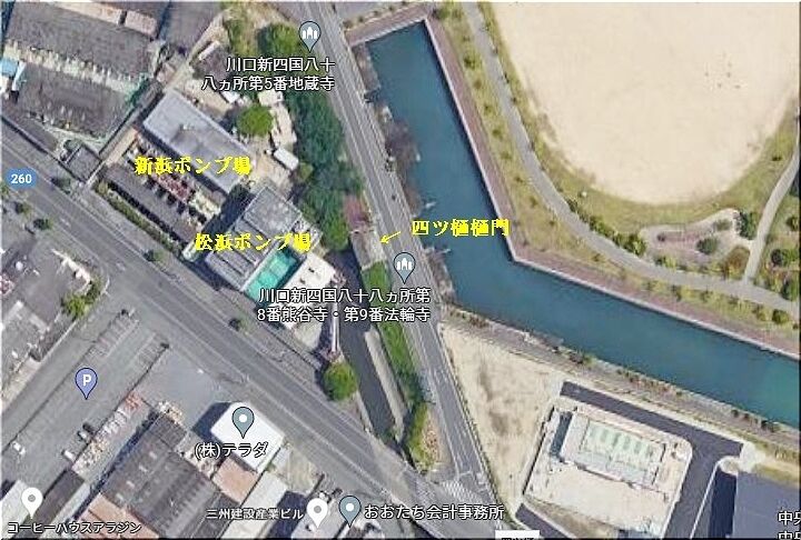 ここは福山南部干拓地でも最も低い場所であり、その為この場所に干拓地にたまった水を拭くための樋門が造られた。樋門が四つあったので〝四ツ樋〟という。