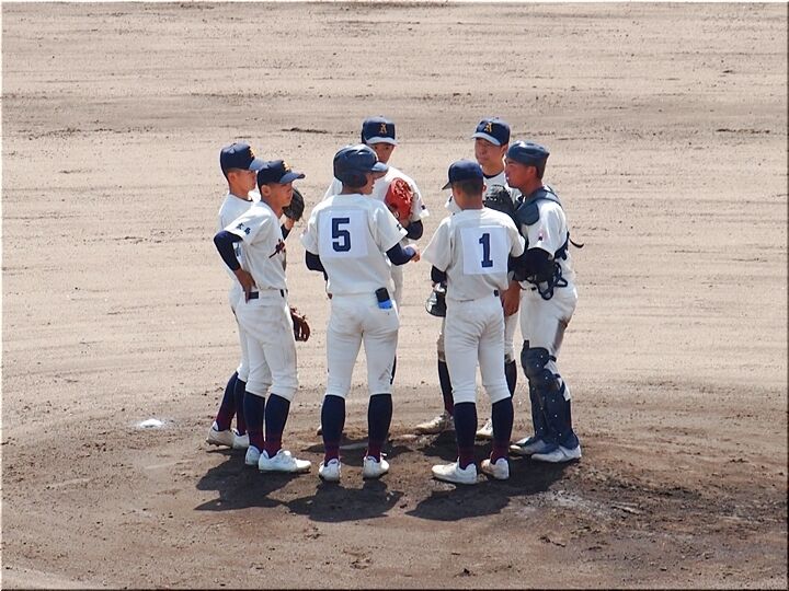 内野手がピッチャーマウンドに集まり、監督からの伝令の確認。神辺旭のピンチですけど、さて、この1点で乗り切る事が出来ますでしょうか…