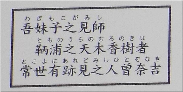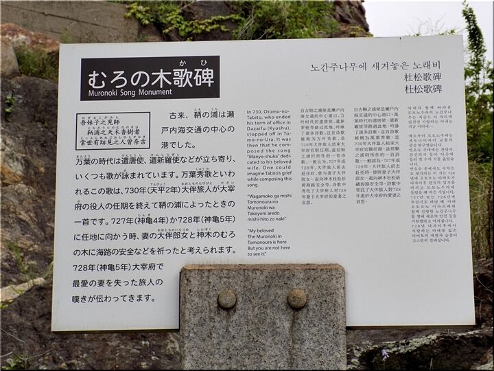 古来、鞆の浦は瀬戸内海交通の中心の港でした。万葉の時代は遣唐使、遣新羅使などが立ち寄り、いくつも歌が詠まれています。万葉秀歌といわれるこの歌は、730年(天平2年)大伴旅人が太宰府の役人の任期を終えて鞆の浦によったときの一首です。727年(神亀4年)か728年(神亀5年)に任地に向かう時、妻の大伴郎女(おおとものいらつめ)と神木のむろの木に海路の安全などを祈ったと考えられます。728年(神亀5年)太宰府で最愛の妻を失った旅人の嘆きが伝わってきます。