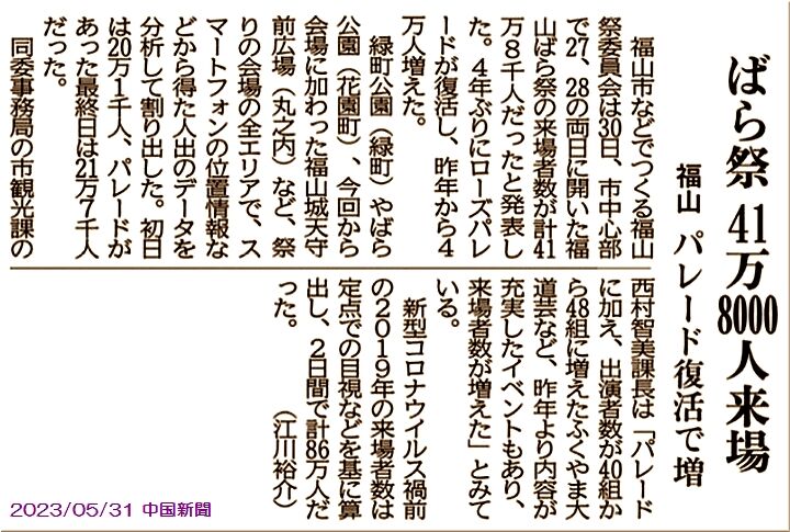 中国新聞sanの朝刊記事によりますと、ふ~ん、5/27(土)~5/28(日)の2日間に開催の『福山ばら祭り』の来場者、41万8千人でしたようですネ。