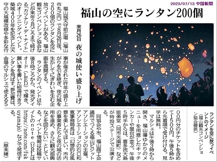 ふ~ん、8/26(土)の夜は、福山城天守前広場で200個のランタンを空に放つイベントが開催されますようであります(^.-)☆