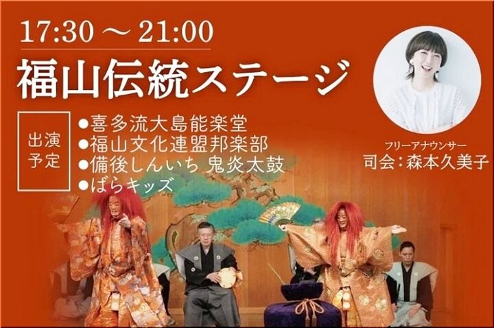 暑さが落ち着く夕方頃から、司会に森本久美子さんを迎え、福山城401年を祝う伝統芸能のステージを開催。地元で活躍する琴奏者や太鼓団体、大島能楽堂による演舞などがステージを盛り上げます!