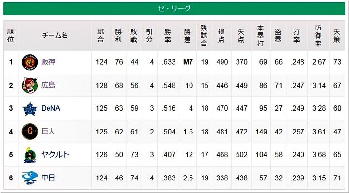 2位広島が3連敗し、首位阪神とのゲーム差は最大10に広がった。