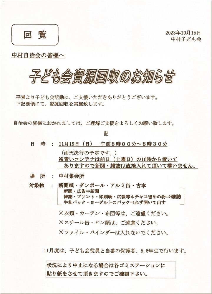 そして、11/19(日)は、「子ども会資源回収日」であります。