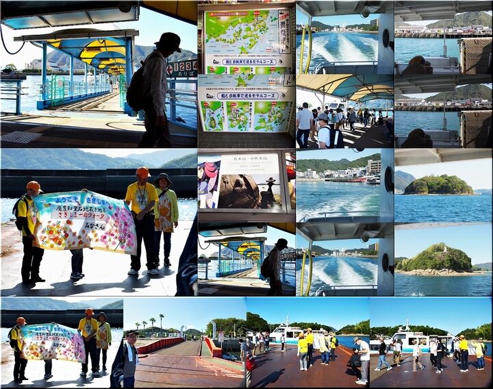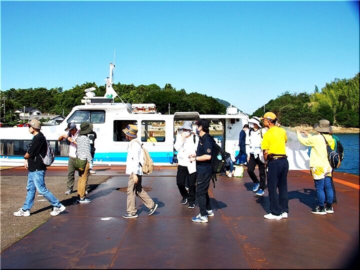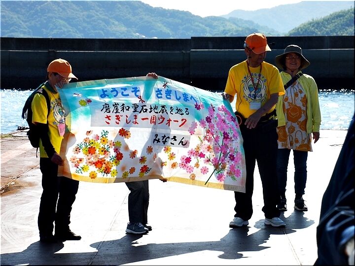 丁度、所要時間15分で〝佐木島〟に到着です。桟橋では、今回の〝さぎしま一周ウォーク〟の主催者の皆様が、華やかな横断幕で迎えて下さいましたネ(^-^)//"