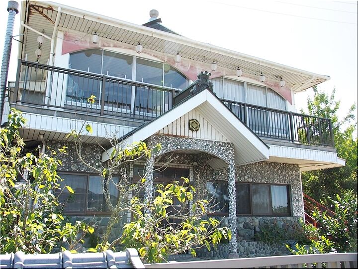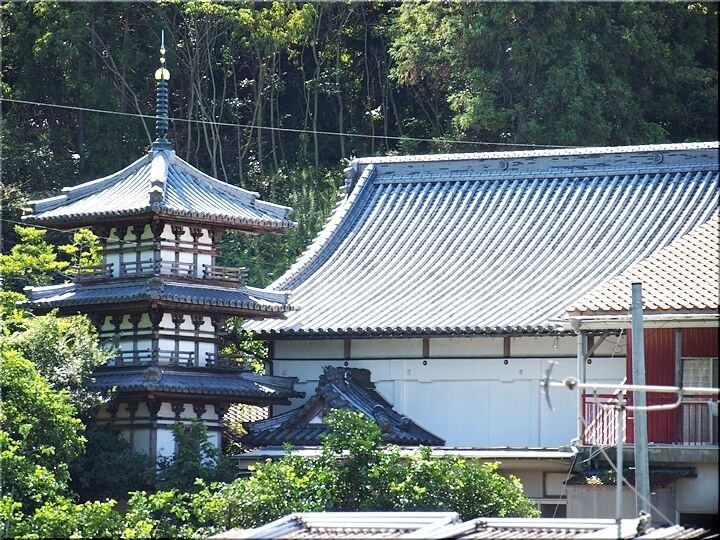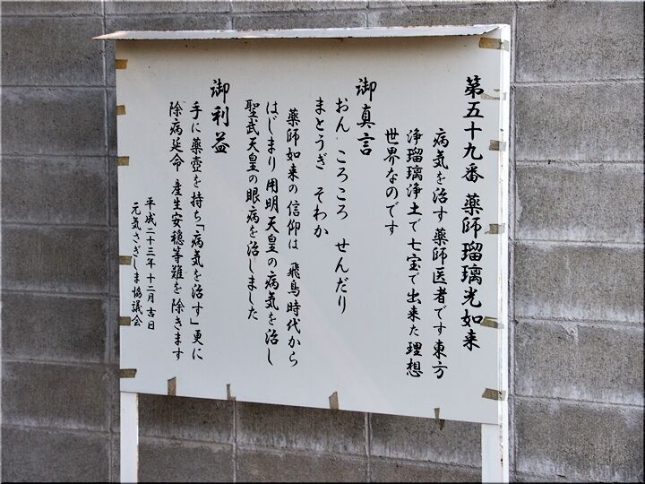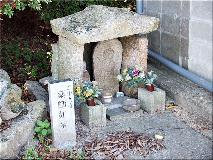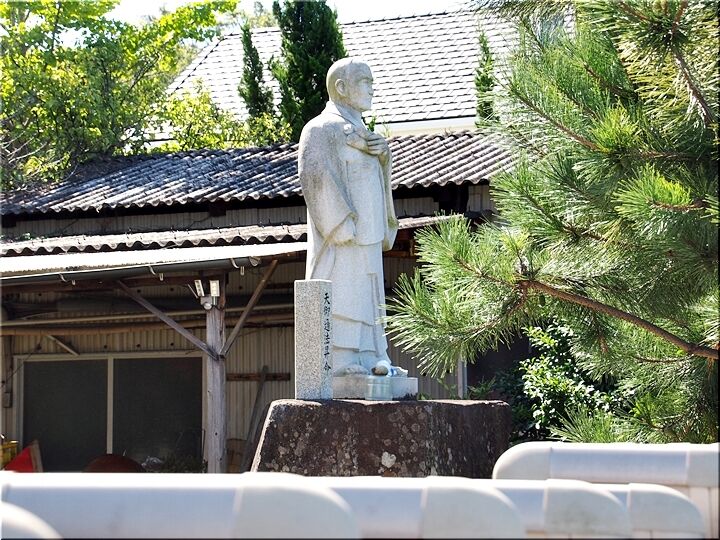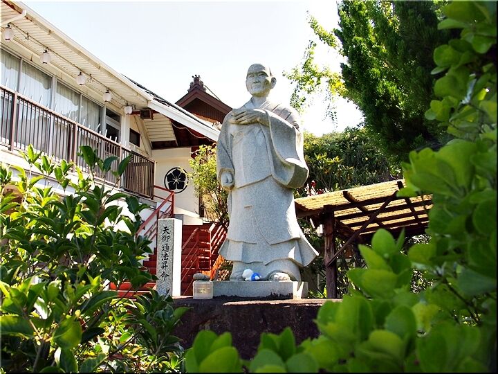向田港方向に進んでおりますと、左手に「第五十九番 薬師瑠璃光如来」「藤見園」。これらを横目に進みますと、また、左手に三重の塔を備えた立派なお寺が…何にも表示がありませんから、何と言うお寺なのか…建物右側には「天御通法昇命」と刻まれた石柱。その隣りに、お上人らしき方の像が…