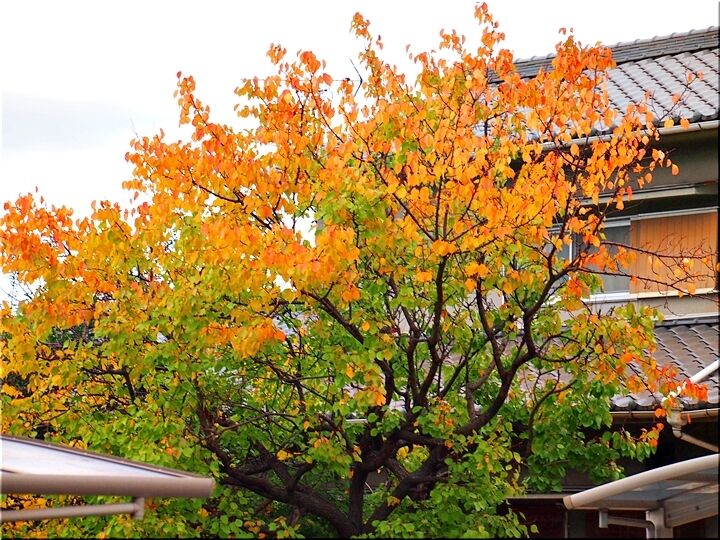こんな天候下で、我が家周辺に眼を向けますと、これは〝杏〟の木なんでしょうネ…樹木の上部は紅葉ですけど、下部は未だ青々と…ふ~ん、紅葉は、上から下方向に進んで行きますのですネ(^.-)☆
