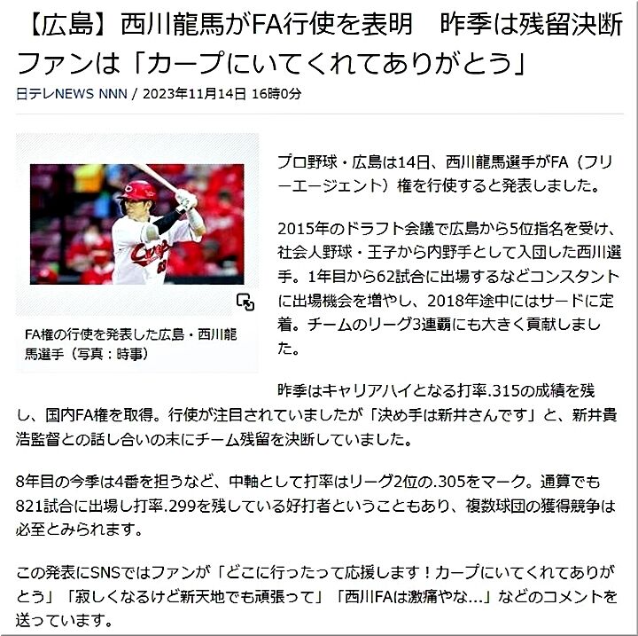 今朝の中国新聞朝刊の第一面、郵便受けから取り出しと同時に眼に入りましたのが、『西川がFA宣言へ』の大きな見出し。これには随分驚きましたネ。