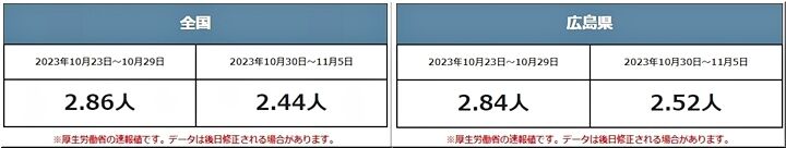 新型コロナウイルス。広島県は2日、10月30日から11月5日までの1週間に広島県内の定点調査で確認された新規感染者数は285人、定点あたり2.52人と発表しました。前週と比べて感染者数は11%減で2週ぶりに減少しています。