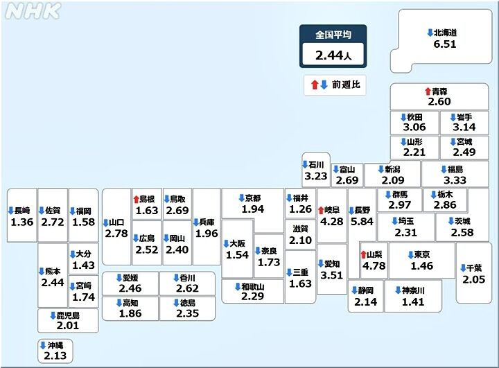 ・6月12日~18日 493人 定点あたり4.36人 前週比 微増