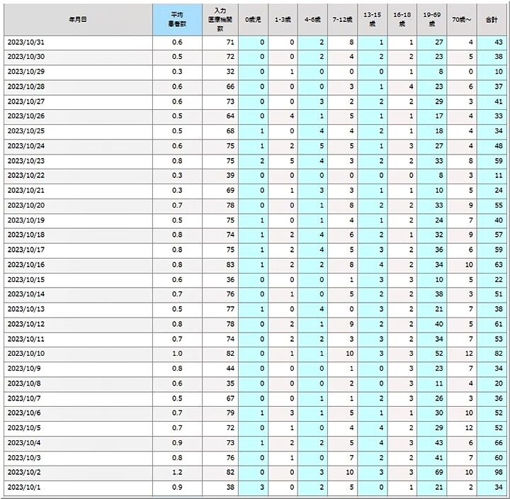 ・10月23日~29日 321人 定点あたり2.84人 前週比 横ばい