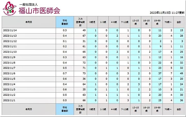 久し振りに、福山市医師会のホームページを覗いてみました。ふん、ふん、ここ最近は、こんな状況で推移ですか…