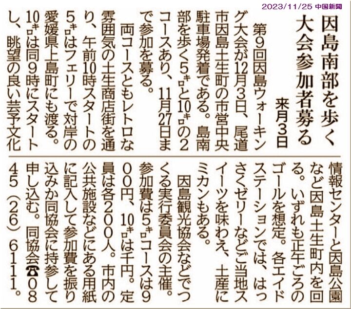 11/25(土)の中国新聞朝刊紙上に、〝第9回「因島ウオーキング大会」〟の開催記事の掲載が(^.-)☆