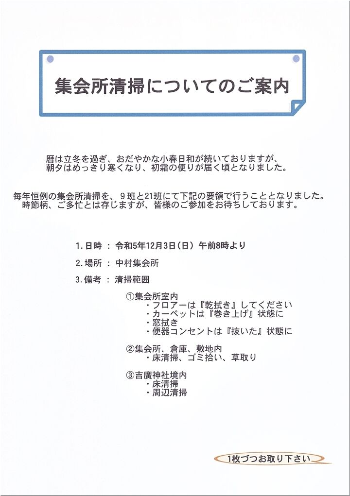 そぅでした、忘れておりましたけど、いつでしたか、自治会の回覧で廻っておりましたけど、12/3(日)は集会所清掃の当番班。嫁さんが出ますから忘れ去っておりました(^-^;