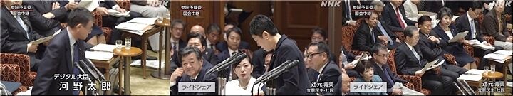 しばらくスマホを操作していた河野氏だったが、これに対し、末松氏が「今、ちょっとスマホの利用は…」と注意を促し、質問者の辻元氏も「だめ」と、ダメだし。河野氏は「だめなんですね」と述べてスマホをしまい、「19年3月とすると、ひょっとすると、私かもしれない」と応じた。