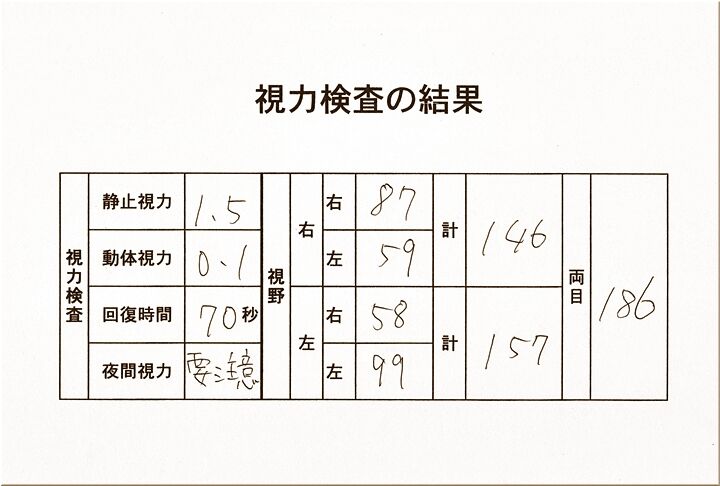 静止視力は〝1.5〟と良いのですけど、問題は〝動体視力0.1〟〝夜間視力 要注意〟。