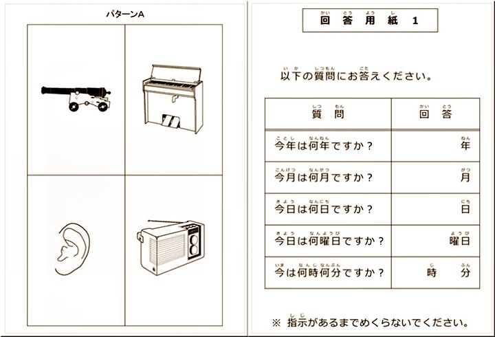 1枚に4つのイラストが記載されているA、B、C、D、4つのイラストパターンが提示され、まずはヒントなしに回答し、さらにヒントをもとに回答します。