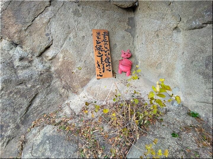 それと、その近くに置かれましたこんなモノも。この赤いニャンコは何なんでしょうネ。『幸せでいい 僕らに ずっと続きますように』と記載の札が…