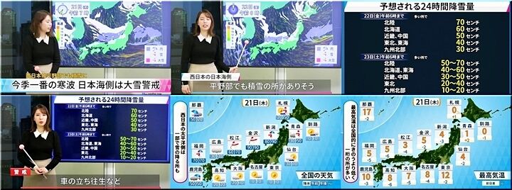◆21日の天気 - 今季一番の寒波 日本海側は大雪警戒 西日本は平野部でも積雪に(21日7時更新)