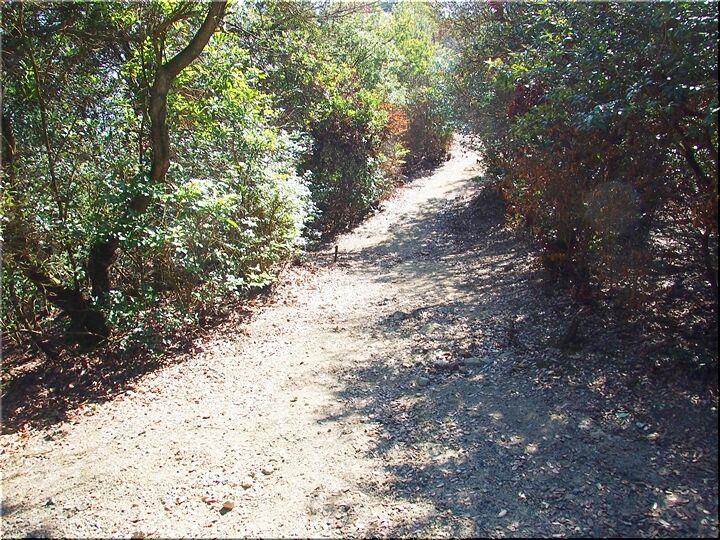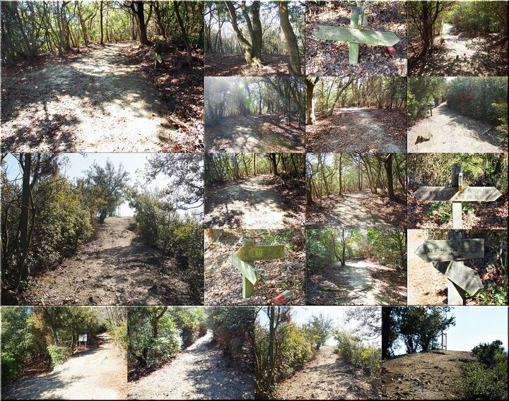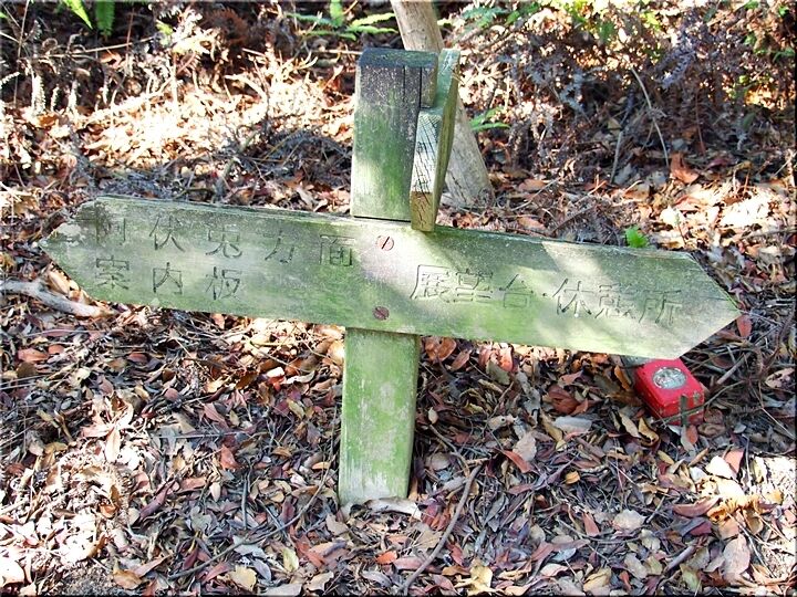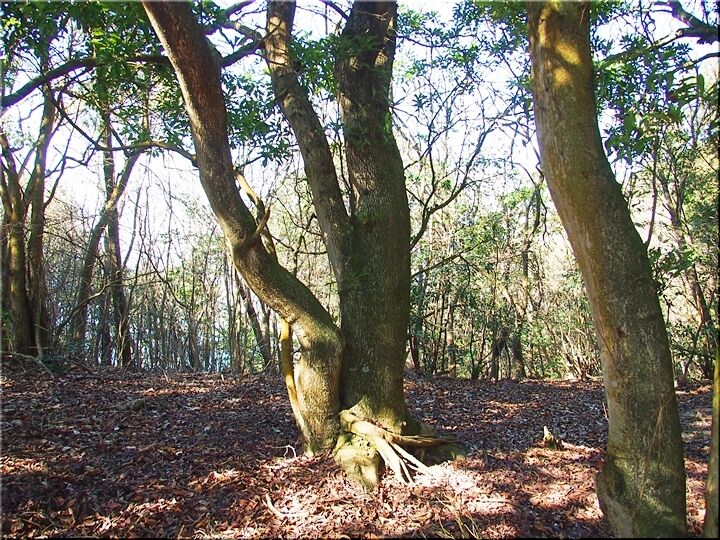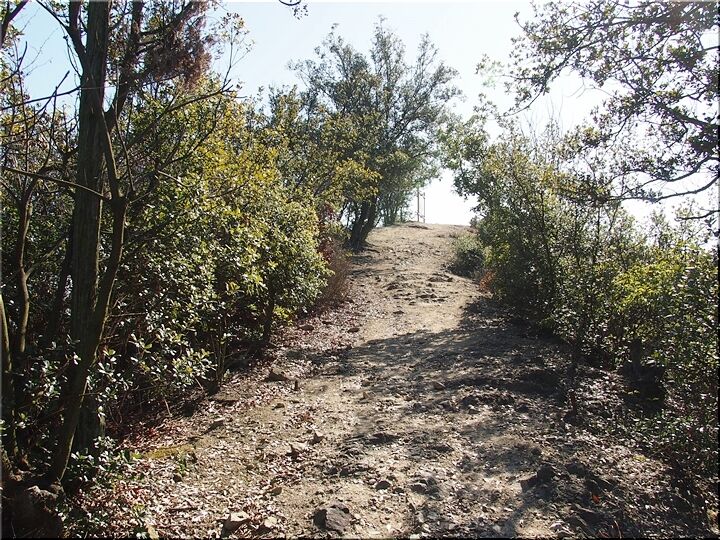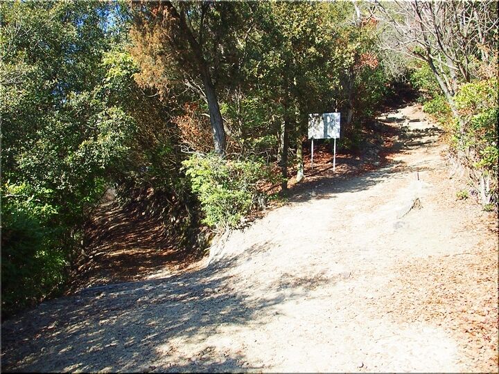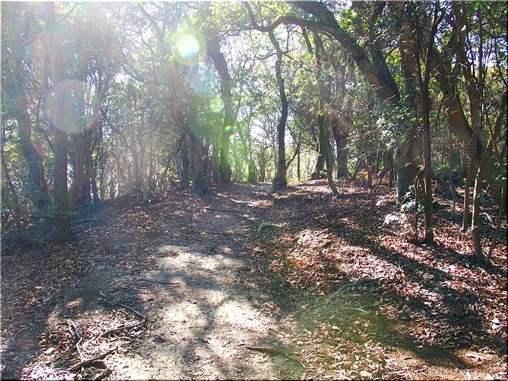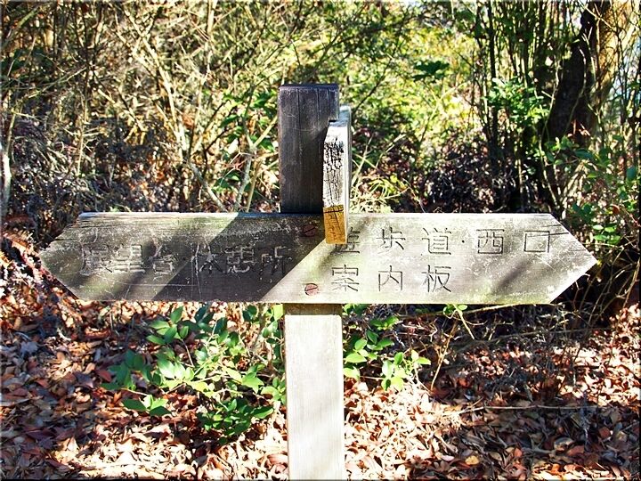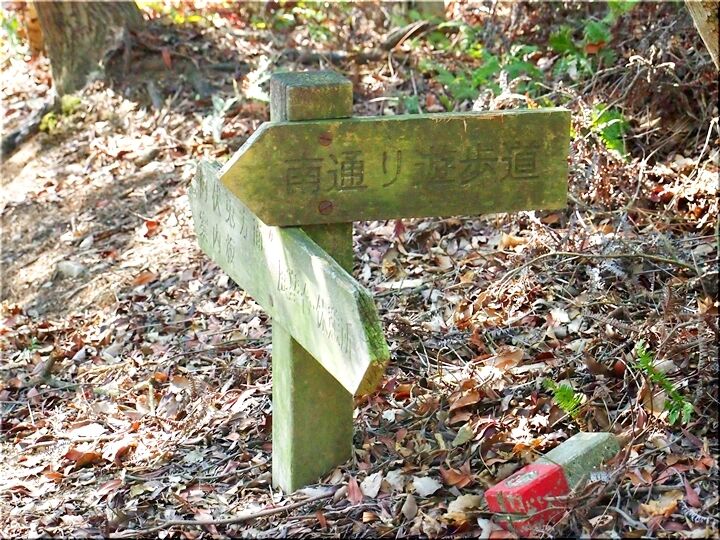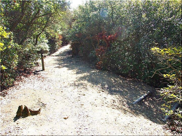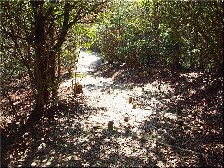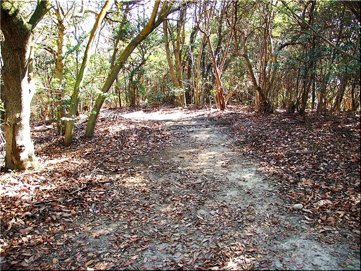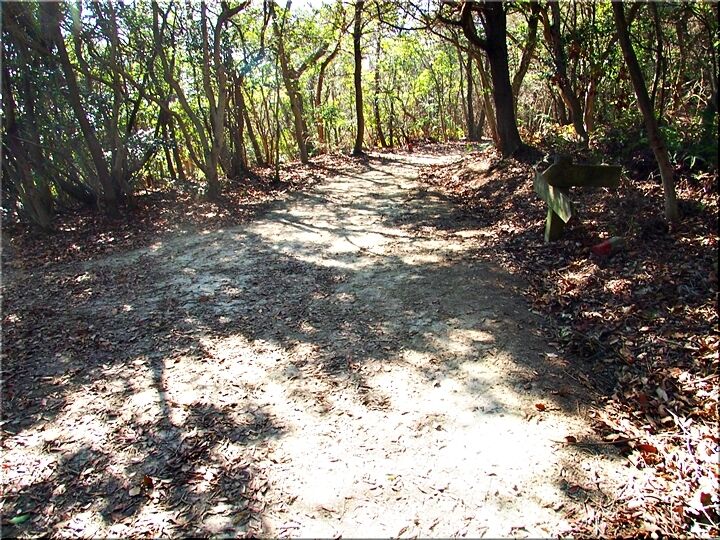 ほぼ平坦地の〝尾根歩き遊歩道〟を進んで行きますと、〝南通り遊歩道〟に下りて行きます三叉路に到着です。前回訪れました時には、下からここに上がって来ましたけど、今回は、もぅ少し先に進み、西側から〝南通り遊歩道〟に降りてみたいと思います。