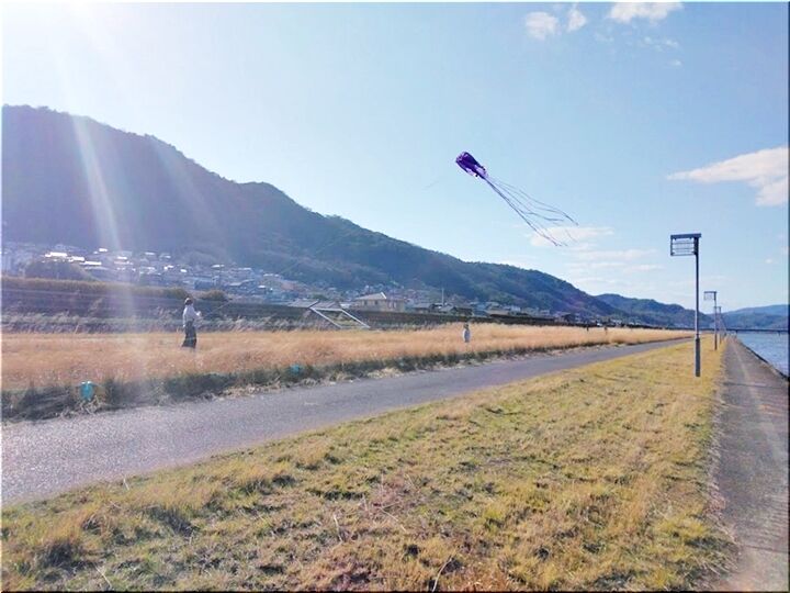 お子さんと、お父さんとでの凧揚げかと思いましたら、次第に近付き、よくよく見ますと凧を揚げておられますのはお母さん(^-^)