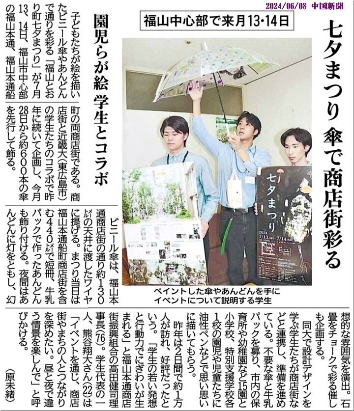 7/13~7/14に開催の「福山とおり町七夕まつり」のため、昨年に続いて企画され、6/28から約600本の傘が先行して飾られましたようであります(^-^)
