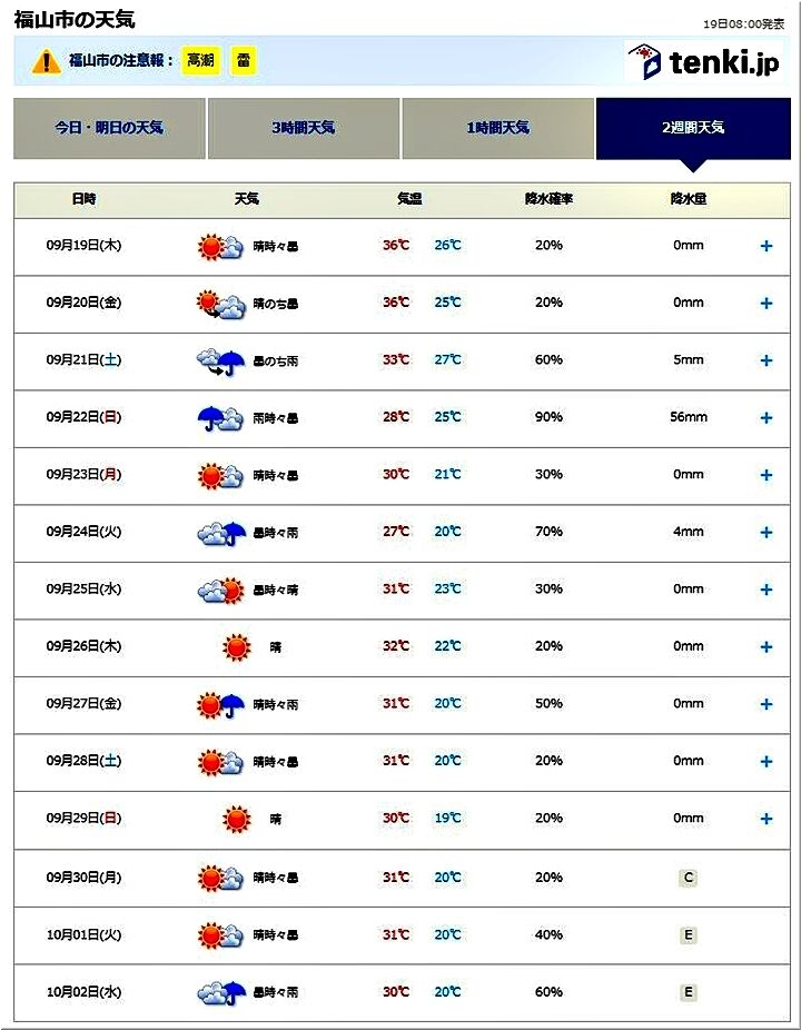福山市の2週間天気を確認しますと、9/19~10/2間で日中の気温が30℃を下廻りますのは二日程度。ウンザリしてしまいます。