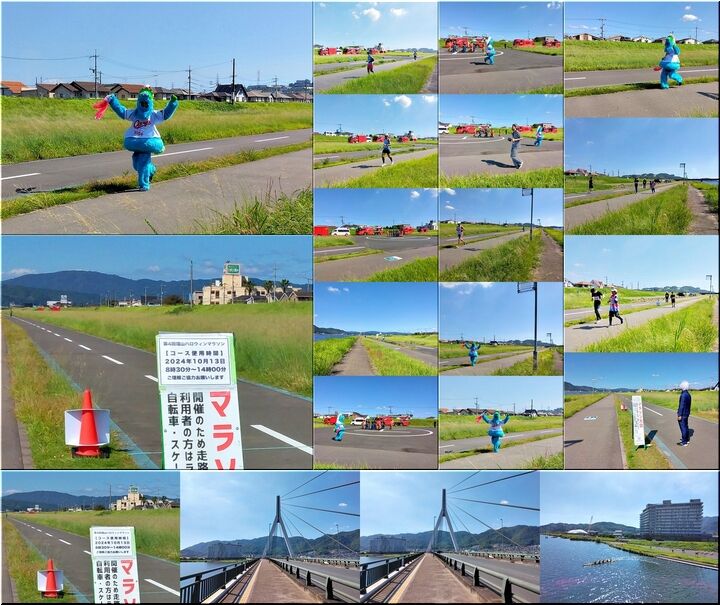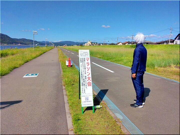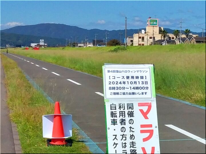 芦田川大橋より少し川上辺りに、折り返し地点が見えて来ましたネ。何か記載がありますから、近寄り確認しますと、ふ~ん、〝第4回福山ハロウィンマラソン〟の開催でありましたか…