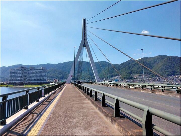 芦田川大橋下を潜りますと土手に上がり、芦田川大橋を渡って帰路に…歩いて渡りますのも、結構久し振りですから、斜張橋の主塔を2枚ばかりパチリです。