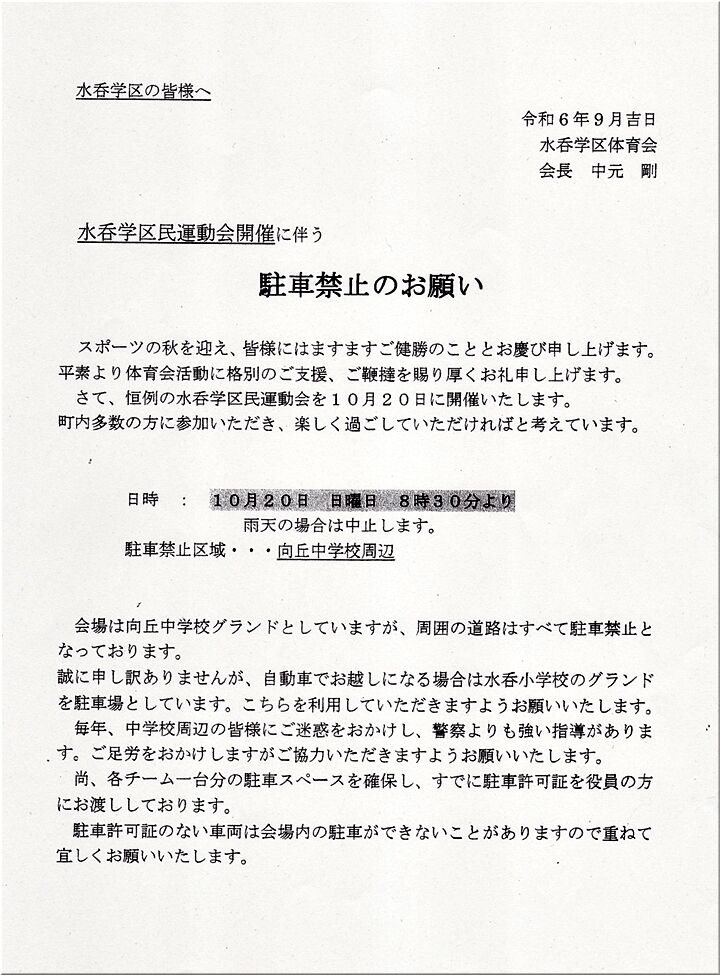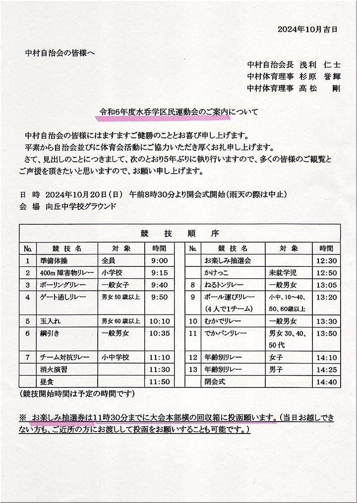 10/20(日)は〝水呑学区民運動会〟の開催で、GONsanは〝ゲート通しリレー〟で、嫁さんは〝ゲート通しリレー・玉入れ〟に出場です。